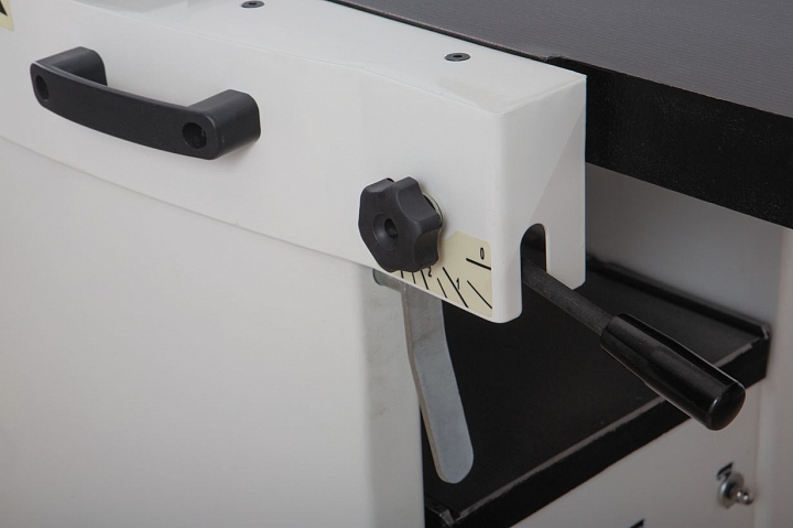 По основным характеристикам и удобству работы этот комбинированный станок не уступает отдельным рейсмусу и фуганку. Длинные и массивные чугунные столы создают базу, достаточную для работы с деталями длиной до 2-3 метров. Относительно специализированного станка несколько облегчен фуговальный упор: он не из чугуна, а из алюминиевого профиля. С другой стороны, эти модели обладают редким достоинством: удобную эксцентриковую регулировку по высоте имеет не только подающий, но и принимающий стол. Это необходимо, прежде всего, при замене строгального вала на helical, режущие пластины которого не регулируются по высоте.